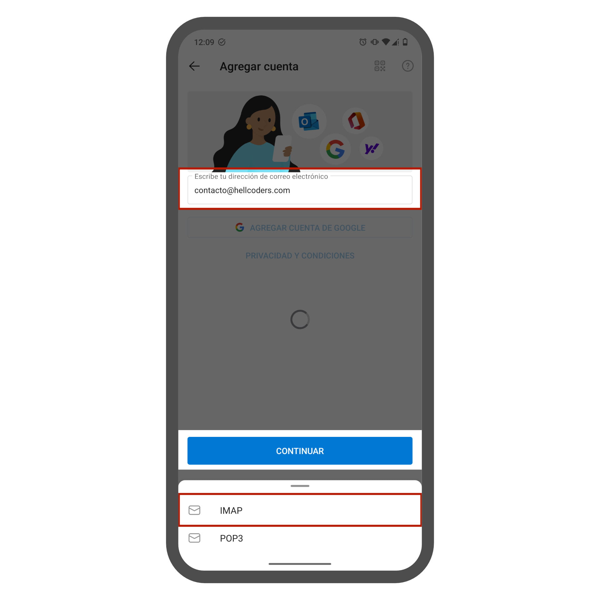 A continuación deberás escribir tu dirección de correo empresarial, dar click en el botón de “Continuar” y seleccionar la opción de “IMAP”